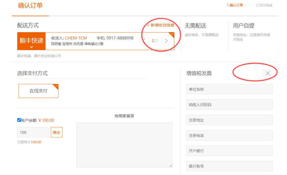 选择相应产品及规格加入购物车,填写正确收货人信息
